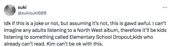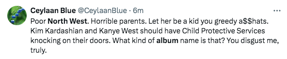 “Poor North West. Horrible parents. Let her be a kid you greedy a$$hats. Kim Kardashian and Kanye West should have Child Protective Services knocking on their doors. What kind of album name is that? You disgust me, truly.”