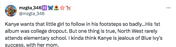 “Kanye wants that little girl to follow in his footsteps so badly…His 1st album was college dropout. But one thing is true, North West rarely attends elementary school. I kinda think Kanye is jealous of Blue Ivy’s success, with her mom.”