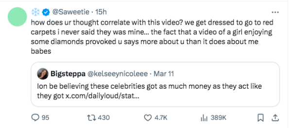 “how does ur thought correlate with this video? we get dressed to go to red carpets i never said they was mine… the fact that a video of a girl enjoying some diamonds provoked u says more about u than it does about me babes”