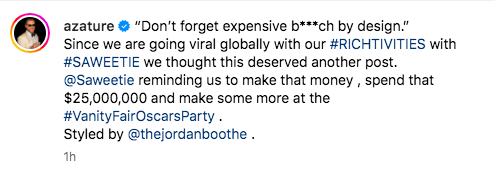 “Since we are going viral globally with our #RICHTIVITIES with #SAWEETIE we thought this deserved another post. @Saweetie reminding us to make that money , spend that $25,000,000 and make some more at the #VanityFairOscarsParty . Styled by @thejordanboothe.”