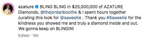 “Thank you #Saweetie for the kindness you showed me and truly a diamond inside and out. We gonna keep on BLINGIN!”