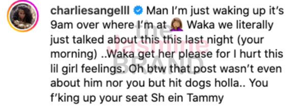 “Man I’m just waking up it’s 9am over where I’m at Waka we literally just talked about this this last night (your morning) ..Waka get her please for I hurt this lil girl feelings. Oh btw that post wasn’t even about him nor you but hit dogs holla.. You f’king up your seat Sh ein Tammy”