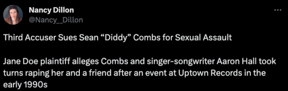 In a separate suit filed by Jane Doe, Combs is accused of partnering with singer/songwriter Aaron Hall in raping two women. According to her complaint, she and a friend met the musicians at an event hosted by MCA Records back in 1990 or 1991. She claims Combs continuously offered her alcohol throughout the evening before inviting her back to Hall’s apartment for an afterparty where he “coerced” her into having sex. After he was finished, Jane Doe says she was left feeling “shocked and traumatized”. While getting dressed, she claims Hall barged into the room, pinned her down, and forced her to have sex with him. She later told her friend what happened and found out that the same incident, beginning with Hall and ending with Combs, had allegedly happened to her as well.