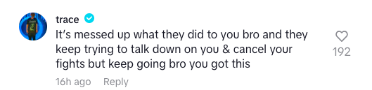 “It’s messed up what they did to you bro and they keep trying to talk down on you & cancel your fights but keep going bro you got this”