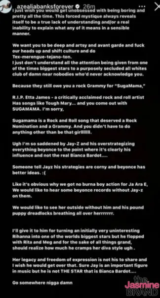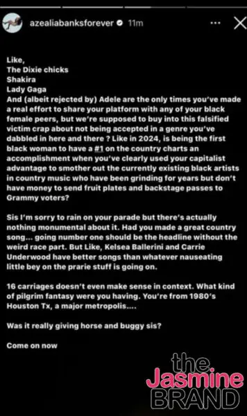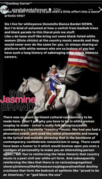 Before she ended her lengthy rant, Azealia Banks also criticized the 32-time Grammy winner for her statement regarding the “Cowboy Carter” album artwork and her entry into the country music world.