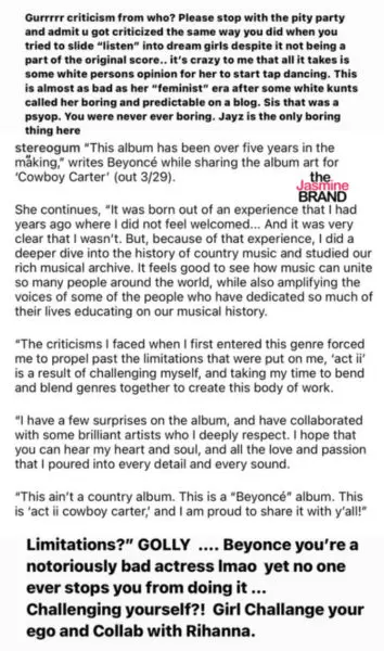 In that statement, Beyoncé addressed the backlash she’s received since taking on country music, writing in part,
