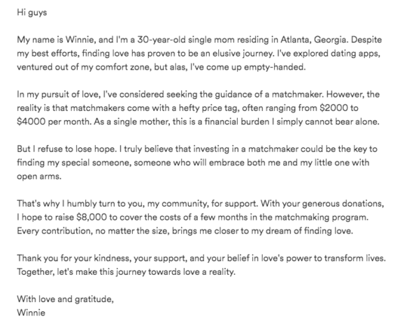The GoFundMe notes that Winnie Parker is seeking to raise $3,000 for her matchmaker dreams, and at the time of this report, she’s received $225.