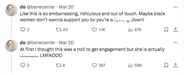 “Like this is so embarrassing, ridiculous and out of touch. Maybe black women don’t wanna support you bc you’re a f*cking clown!”