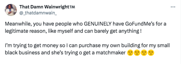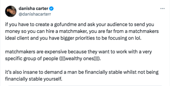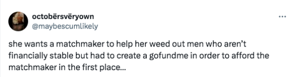 “she wants a matchmaker to help her weed out men who aren’t financially stable but had to create a gofundme in order to afford the matchmaker in the first place…”
