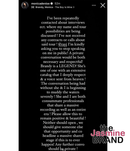 The “So Gone” artist went on to ask that the process of the woman coming together for a tour remain “beautiful and positive” as they both are “consummate professionals.” Monica added that she doesn’t think either she or Brandy should open, rather they give another artist that opportunity, and the singing vets would operate as co-headliners.