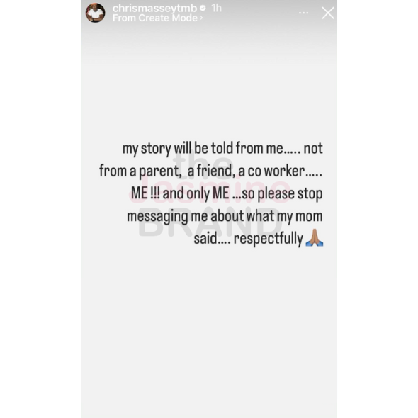 “my story will be told from me….. not from a parent, a friend, a co worker ….. ME !!! and only ME …so please stop messaging me about what my mom said…. respectfully [praying hands Emoji]”