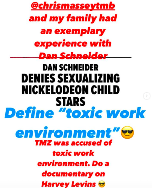 “@chrismasseytmb and my family had an exemplary experience with Dan Schneider / Define “toxic work environment” / TMZ was accused of toxic work environment. Do a documentary on Harvey Levins”