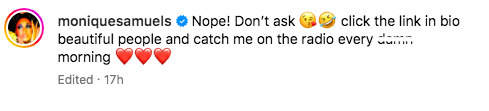 “Nope! Don’t ask [kiss face emoji] [laughing face emoji] click the link in bio beautiful people and catch me on the radio every d*mn morning [red hearts emojis]”