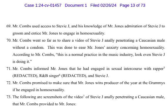“Mr. Combs went so far as to share a video of Stevic J anally penetrating a Caucasian male without a condom. This was done to ease Mr. Jones’ anxiety concerning homosexuality. According to Mr. Combs, ‘this is a normal practice in the music industry, look even Stevie J is doing it.’”