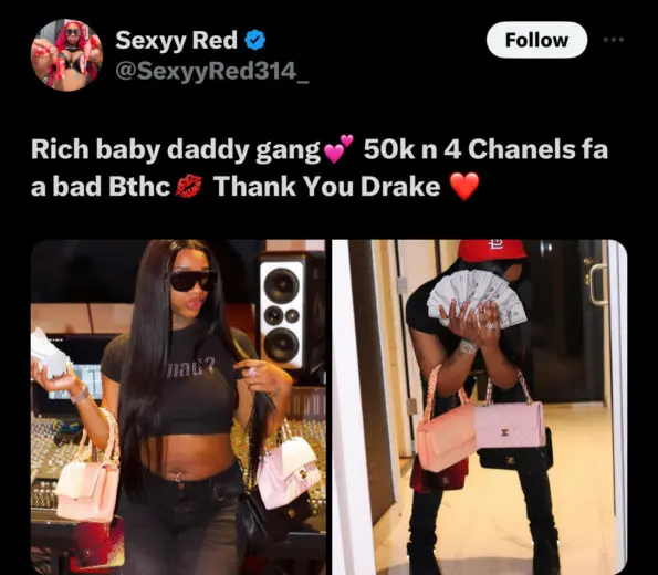 In addition, the OVO Sound founder recently gifted the “Skee Yee” rapper four Chanel bags and wads of cash amounting to $50,000. Sexyy Red showcased all the lavish gifts on X, shouting out her “rich baby daddy” Drake. On March 9, she wrote,