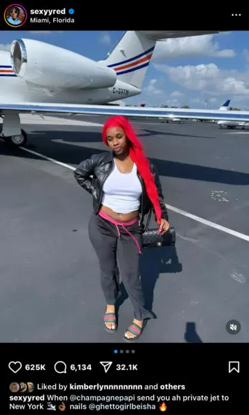 For example, on Thursday (March 28), Sexyy Red, who recently welcomed her second child, took to Instagram to show off her latest perk of being friends with the 6 God. The post featured Sexyy Red posing in front of a private jet with the caption that read, in part,