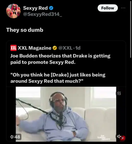 Provoking Sexyy Red’s response was Joe Budden’s original remark about Drake receiving a check off the success of other rappers. According to Joe Budden, this would explain why Drake has appeared in Red’s music videos and continues publicly supporting her.