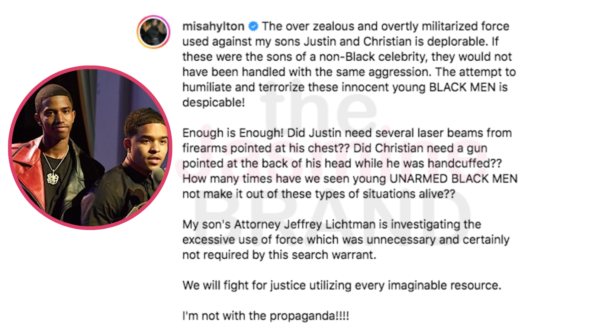 “The over zealous and overtly militarized force used against my sons Justin and Christian is deplorable. If these were the sons of a non-Black celebrity, they would not have been handled with the same aggression. The attempt to humiliate and terrorize these innocent young BLACK MEN is despicable!”