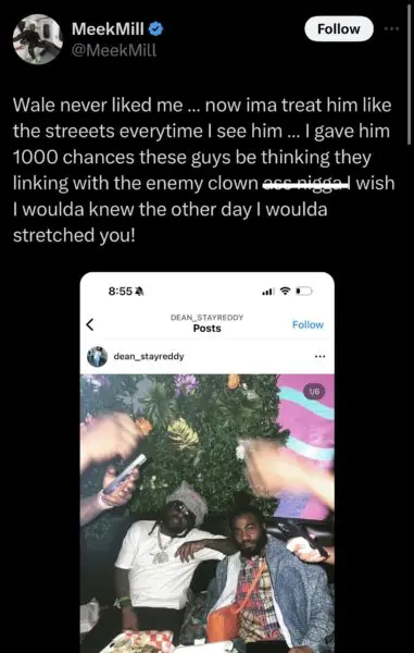 This morning Meek Mill wasted no time hopping on X and slamming fellow rapper Wale for linking with someone he’s no longer cool with. To kick off his series of fiery posts, Meek Mill shared a picture of the “Ride Out” artist alongside someone he seemingly has an issue with. Meek Mill captioned the post,