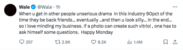 “When u get in other people unserious drama in this industry 90pct of the time they be back friends… eventually ..and then u look silly… in the end… so I love minding my business. If a photo can create such vitriol , one has to ask himself some questions. Happy Monday”