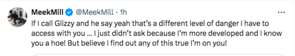“If I call Glizzy and he say yeah that’s a different level of danger I have to access with you … I just didn’t ask because I’m more developed and I know you a hoe! But believe I find out any of this true I’m on you!”