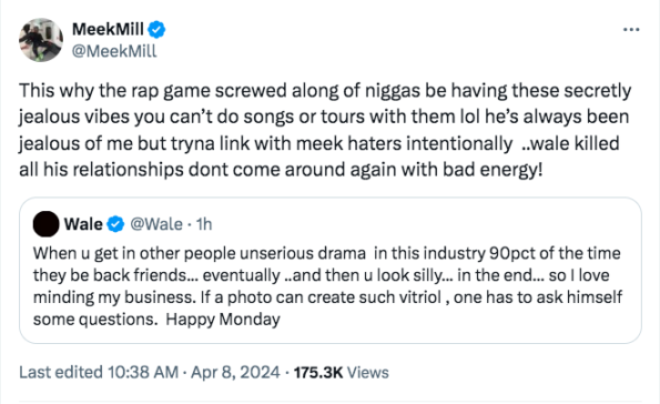 “This why the rap game screwed along of n*gg*s be having these secretly jealous vibes you can’t do songs or tours with them lol he’s always been jealous of me but tryna link with meek haters intentionally ..wale killed all his relationships dont come around again with bad energy!”