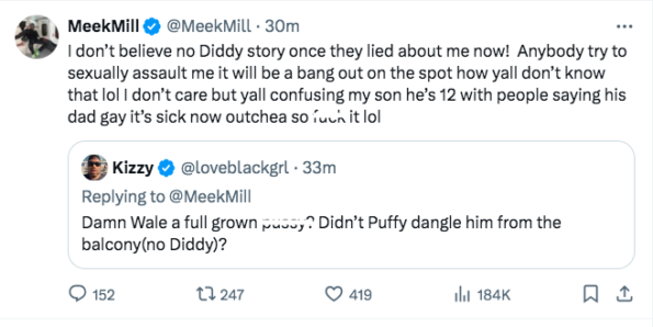“I don’t believe no Diddy story once they lied about me now! Anybody try to sexually assault me it will be a bang out on the spot how yall don’t know that lol I don’t care but yall confusing my son he’s 12 with people saying his dad gay it’s sick now outchea so f*ck it lol”