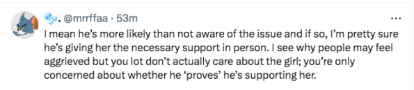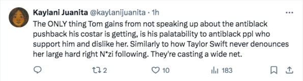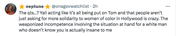 “I actually agree wholeheartedly because the number of Black women and girls (!!!) who get thrown to rabid, racist fan bases with little to no PUBLIC shows of support by costars is just unconscionable”