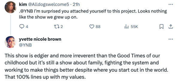 However, the show’s leading lady Yvette Nicole Brown who voices the series’ new matriarch Beverly Evans, urges fans of the original Good Times not to throw in the towel just yet. Responding to a social media user who questioned why Brown attached herself to the project, the actress responded: