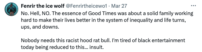 “No. Hell, NO. The essence of Good Times was about a solid family working hard to make their lives better in the system of inequality and life turns, ups, and downs. Nobody needs this racist hood rat bull. I’m tired of black entertainment today being reduced to this… insult.”