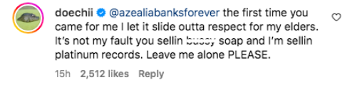 “[Azealia Banks] the first time you came for me I let it slide outta respect for my elders. It’s not my fault you sellin b*ssy soap and I’m sellin platinum records. Leave me alone PLEASE.”
