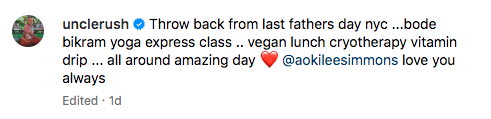 “Throw back from last fathers day nyc …bode bikram yoga express class .. vegan lunch cryotherapy vitamin drip … all around amazing day [red heart emoji] @aokileesimmons love you always”