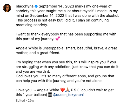 “September 14 , 2023 marks my one-year of sobriety this year taught me a lot about myself. I made up my mind on September 14, 2022 that I was done with the alcohol. This process is not easy but I did it, I plan on continuing practicing sobriety.”