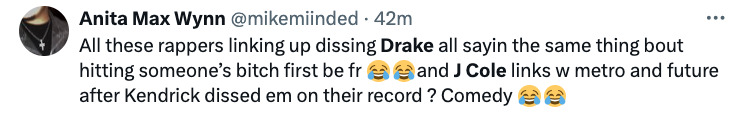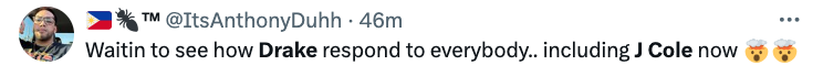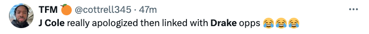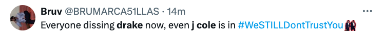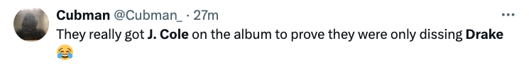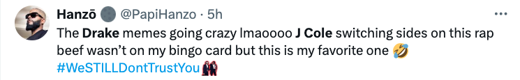 “The Drake memes going crazy lmaoooo J Cole switching sides on this rap beef wasn’t on my bingo card but this is my favorite one”