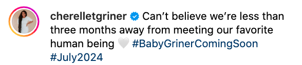 “Can’t believe we’re less than three months away from meeting our favorite human being #BabyGrinerComingSoon#July2024”