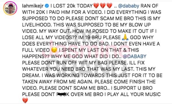 “THIS WAS SUPPOSED TO BE MY BLOW UP VIDEO. MY WAY OUT. HOW I’M [SUPPOSED] TO MAKE IT OUT IF I LOSE ALL MY VIDEOS?? I’M 19 … PLEASE GOD WHY DOES EVERYTHING HAVE TO GO BAD. I DON’T EVEN HAVE A FULL VIDEO. I SPENT MY LAST ON THAT & THIS HAPPPENS?? WHY ME GOD WHAT DID I DO @DABABY PLEASE DON’T RUN OFF [WITH] MY BAG PLEASE. I’LL FIX WHATEVER YOU NEED BRO THAT WAS MY LAST. THIS MY DREAM. I WAS WORKING TOWARDS THIS JUST FOR IT TO BE TAKEN AWAY FROM ME AGAIN. PLEASE COME FINISH THE VIDEO. PLEASE DON’T SCAM ME BRO.”