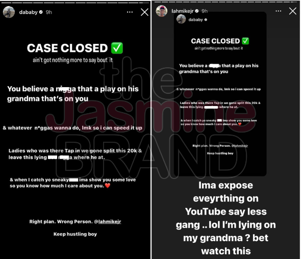 “Case closed. Ain’t got nothing more to say ’bout it. You believe a n*gga that a play on his grandma that’s on you. & whatever n*ggas wanna do, lmk so I can speed it up. Ladies who was there Tap in we gone split this 20k & leave this lying a** n*gga where he at. & when I catch yo sneaky a** ima show you some love so you know how much i care about you. Right plan. Wrong person. @lahmikejr Keep husting boy.”