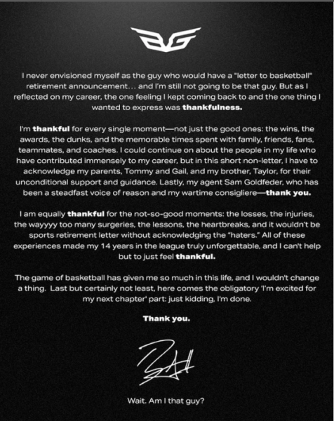 “I never envisioned myself as the guy who would have a “letter to basketball” retirement announcement… and I’m still not going to be that guy. But as I reflected on my career, the one feeling I kept coming back to and the one thing ! wanted to express was thankfulness. I’m thankful for every single moment-not just the good ones: the wins, the awards, the dunks, and the memorable times spent with family, friends, fans, teammates, and coaches.”