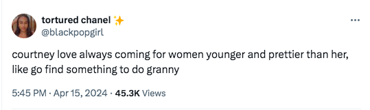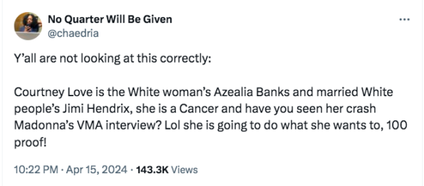“Y’all are not looking at this correctly: Courtney Love is the White woman’s Azealia Banks and married White people’s Jimi Hendrix, she is a Cancer and have you seen her crash Madonna’s VMA interview? Lol she is going to do what she wants to, 100 proof!”