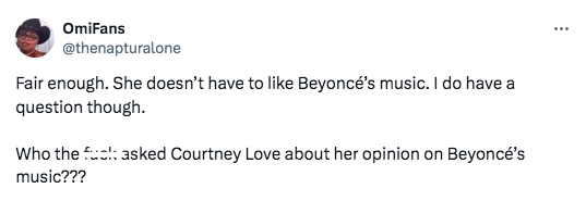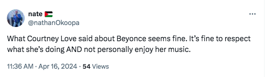 “I like the idea of Beyoncé doing a country record because it’s about Black women going into spaces where previously only white women have been allowed, not that I like it much. As a concept, I love it. I just don’t like her music.”
