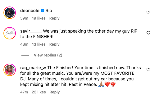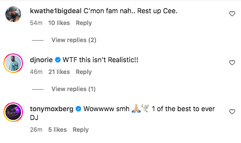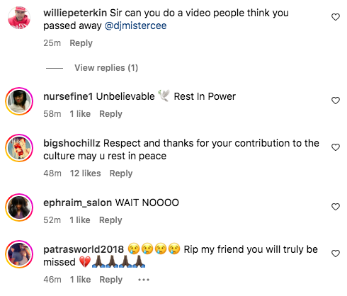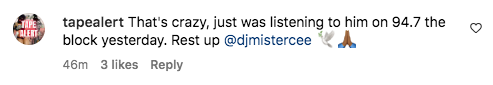 “That’s crazy, just was listening to him on 94.7 the block yesterday. Rest up @djmistercee”