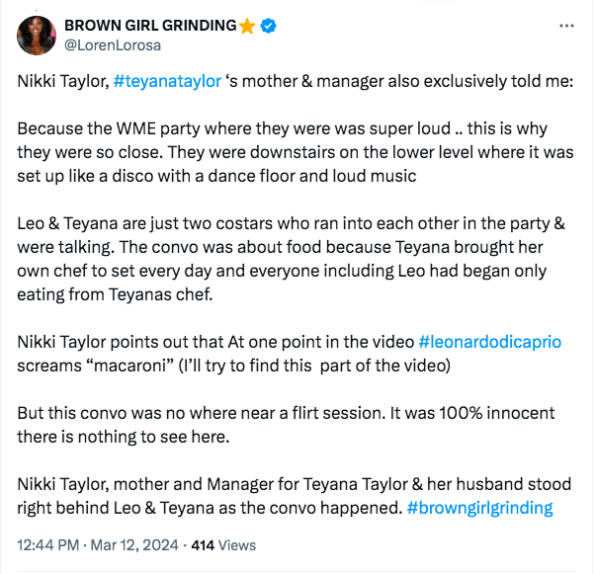 “Leo & Teyana are just two costars who ran into each other in the party & were talking. The convo was about food because Teyana brought her own chef to set every day and everyone including Leo had began only eating from Teyanas chef.”