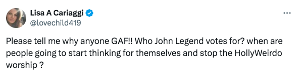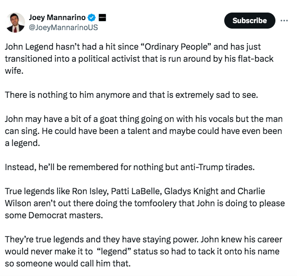 “John Legend hasn’t had a hit since “Ordinary People” and has just transitioned into a political activist that is run around by his flat-back wife. There is nothing to him anymore and that is extremely sad to see. John may have a bit of a goat thing going on with his vocals but the man can sing. He could have been a talent and maybe could have even been a legend. Instead, he’ll be remembered for nothing but anti-Trump tirades.”