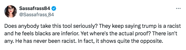“Does anybody take this tool seriously? They keep saying trump is a racist and he feels blacks are inferior. Yet where’s the actual proof? There isn’t any. He has never been racist. In fact, it shows quite the opposite.”
