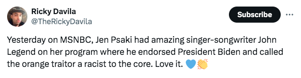 Toward the end of the viral clip of Legend’s sit-down with Psaki, he referred to President Joe Biden as a “really decent man who’s done a lot to improve lives in this country.” Legend then noted that he would be persisting in his support for Biden.