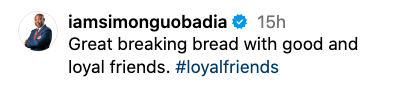 “Great breaking bread with good and loyal friends. #loyalfriends”