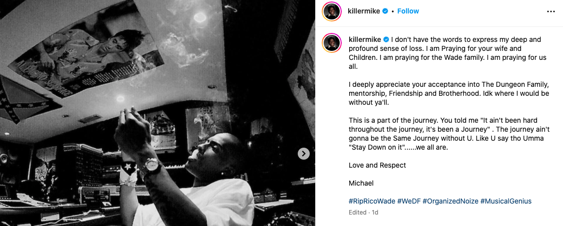 “This is a part of the journey. You told me “It ain’t been hard throughout the journey, it’s been a Journey” . The journey ain’t gonna be the Same Journey without U. Like U say tho Umma “Stay Down on it”……we all are. Love and Respect Michael #RipRicoWade#WeDF#OrganizedNoize#MusicalGenius”