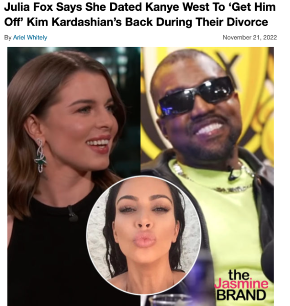 If you recall, Julia Fox and Kanye West dated for a little over a month, shortly after the Vultures artist officially split from Kim Kardashian. At the time, the Uncut Gems actress claimed that dating the musician was “the best thing” that had happened to her in a while. More recently, however, she stated that she actually only dated West to give the SKIMS founder some breathing room from her ex-husband.