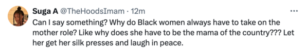 “Why do Black women always have to take on the mother role? Like why does she have to be the mama of the country??? Let her get her silk presses and laugh in peace.”