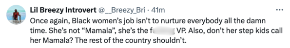 “Once again, Black women’s job isn’t to nurture everybody all the damn time. She’s not ‘Momala,’ she’s the f***ing VP. Also, don’t her stepchildren call her ‘Momala’? The rest of the country shouldn’t.”